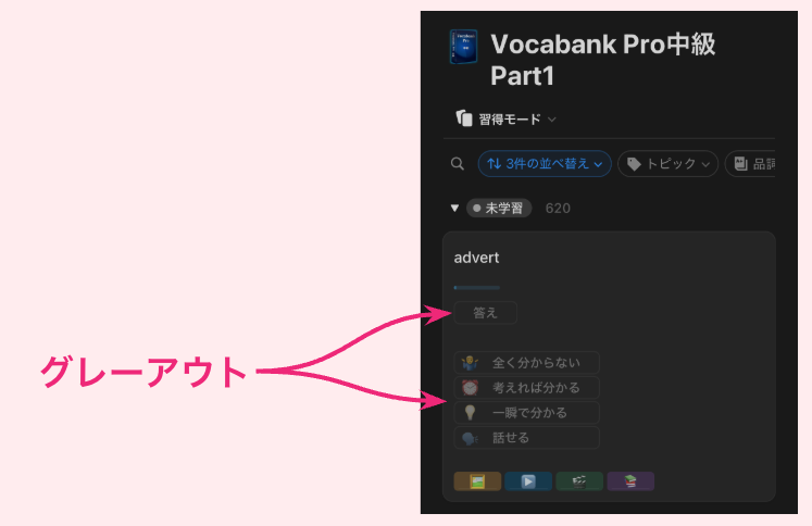 習得度ボタンを押すと設定画面が表示されてしまい機能しない 習得度ボタンがグレーアウトしていて押せない。 復習モードに単語が表示されない⚙️ 誤って設定を変更してしまった場合のトラブル
