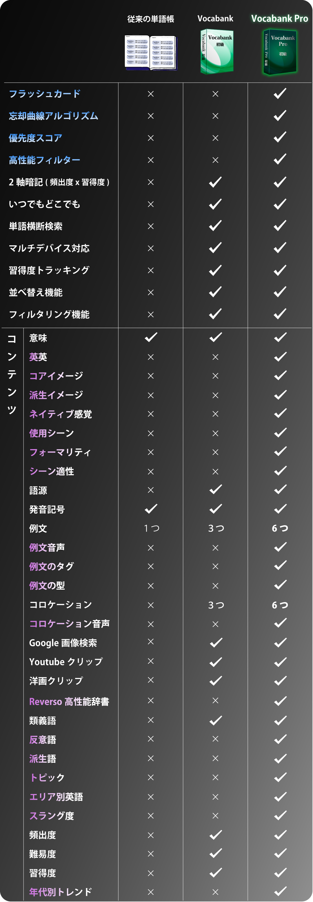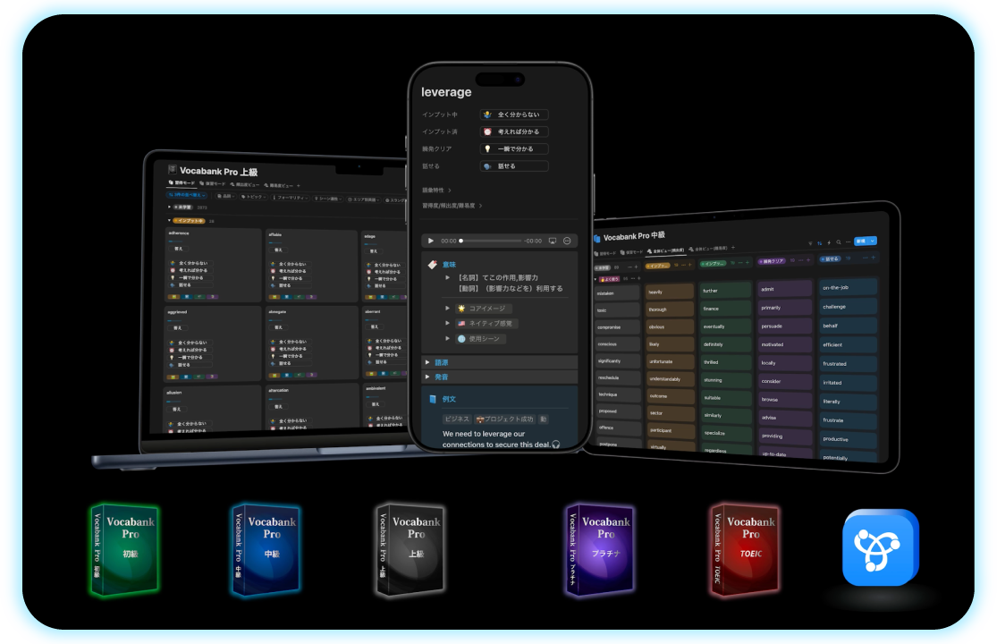 はい、VocabankとVocabank Proには、それぞれのPartに同じ単語が収録されています。ただし、Pro版では、機能面・コンテンツ面の両方で大幅なアップグレードが施されており、より効率的で実践的な学習が可能です。