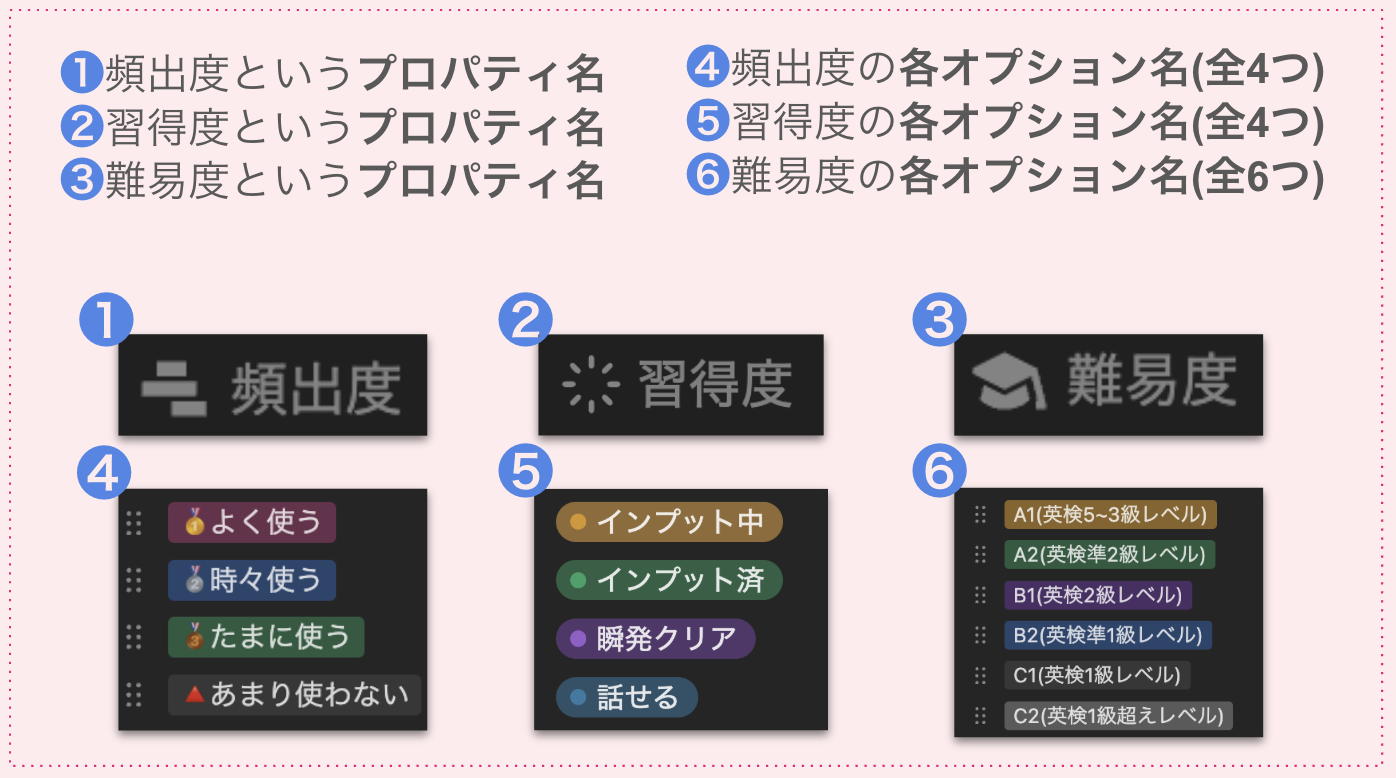 「頻出度」「習得度」「難易度」の名前について 下の画像に示されている「頻出度」「習得度」「難易度」のプロパティ名と、それぞれのオプション名(選択肢の名前)は、デフォルトから変更しないようお願いします。これらの名前を変更すると、優先度スコアが正常に機能しなくなります。もし誤って変更してしまった場合は、元の名前に戻していただければ、再び正常に機能します。