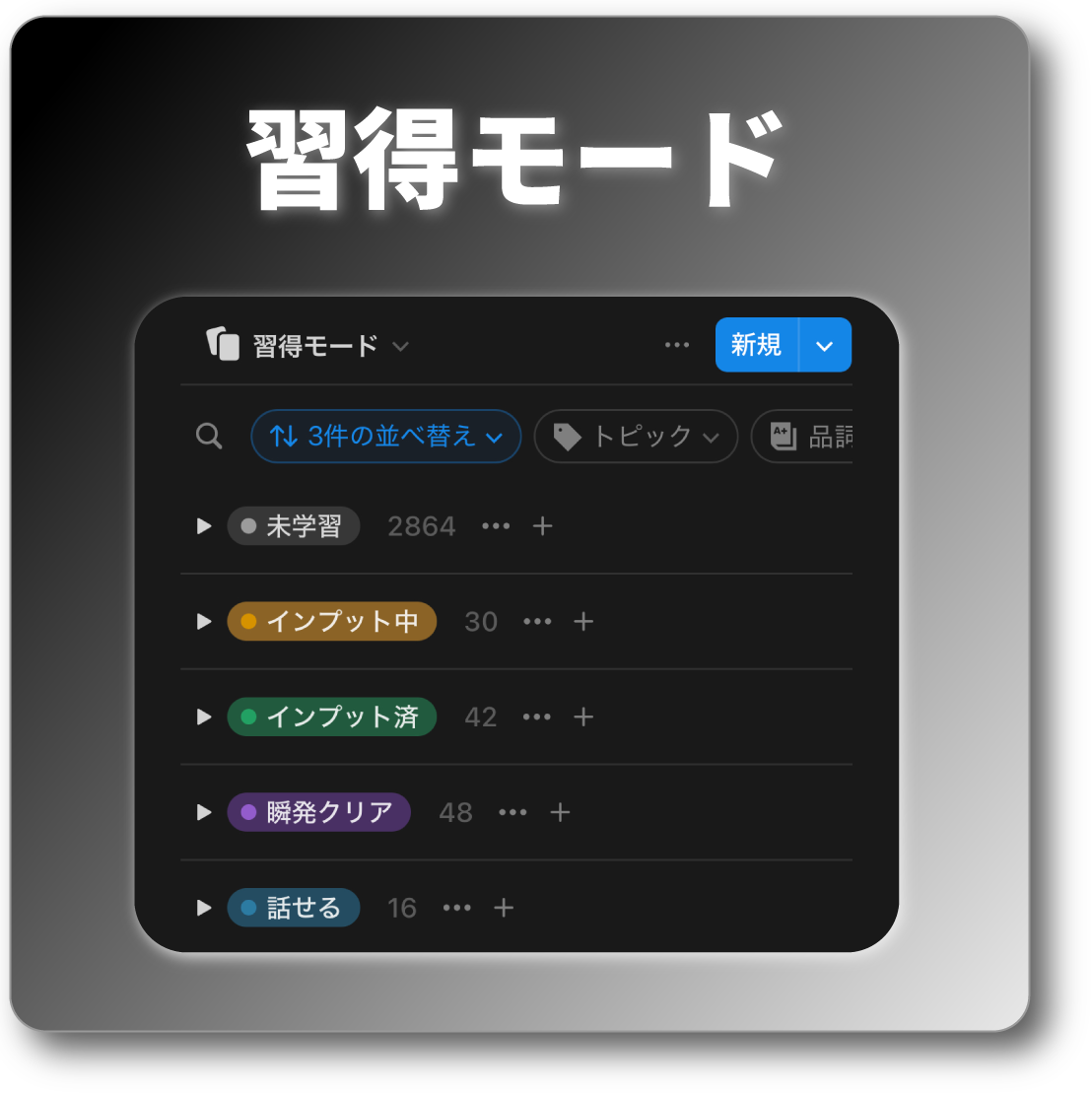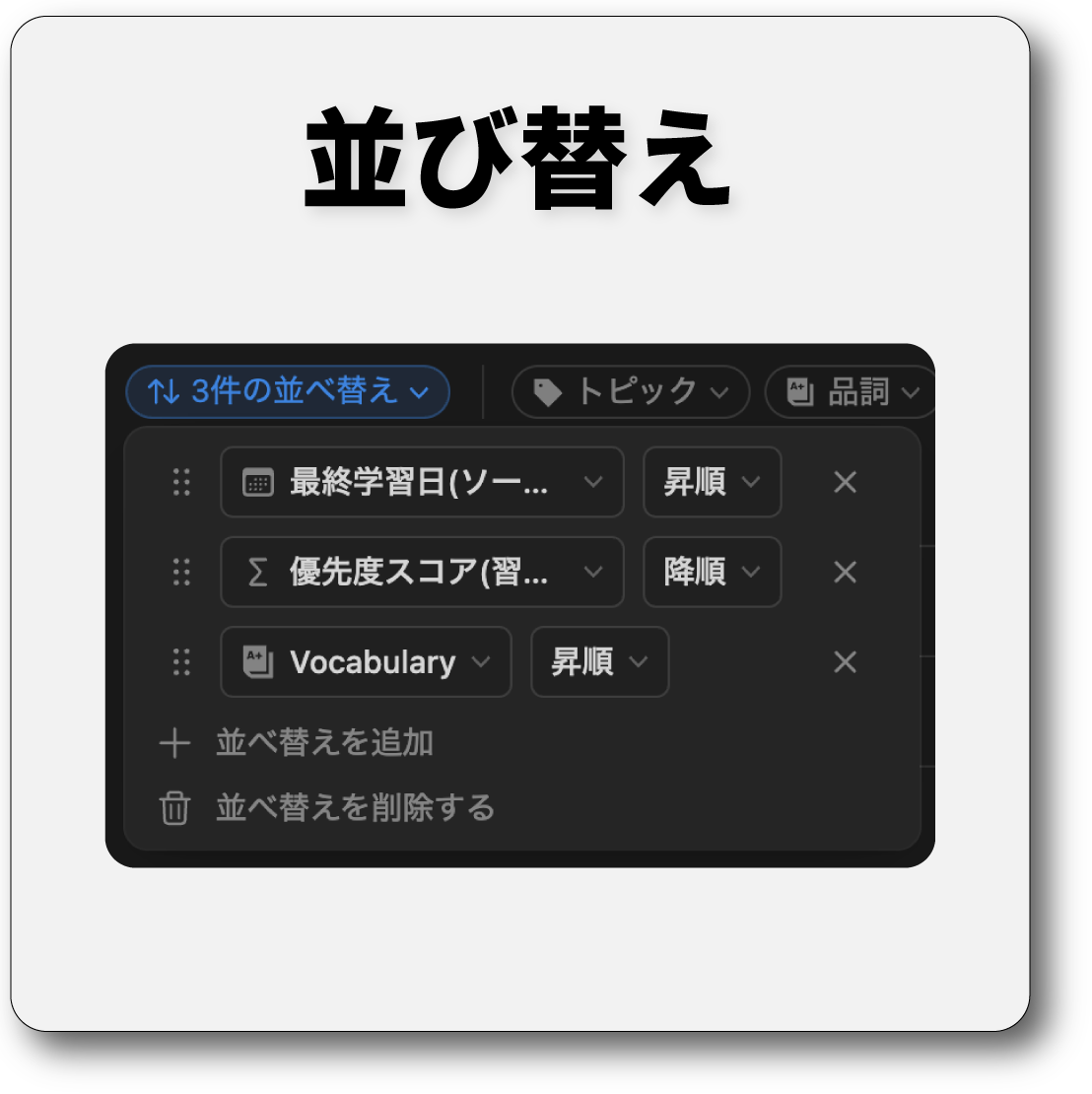 並べ替え(ソート)の設定を削除してしまい、優先度スコア順で表示されなくなった 答えボタンを押しても答えが表示されなくなった フラッシュカード上の習得率バーが表示されなくなったよくある質問