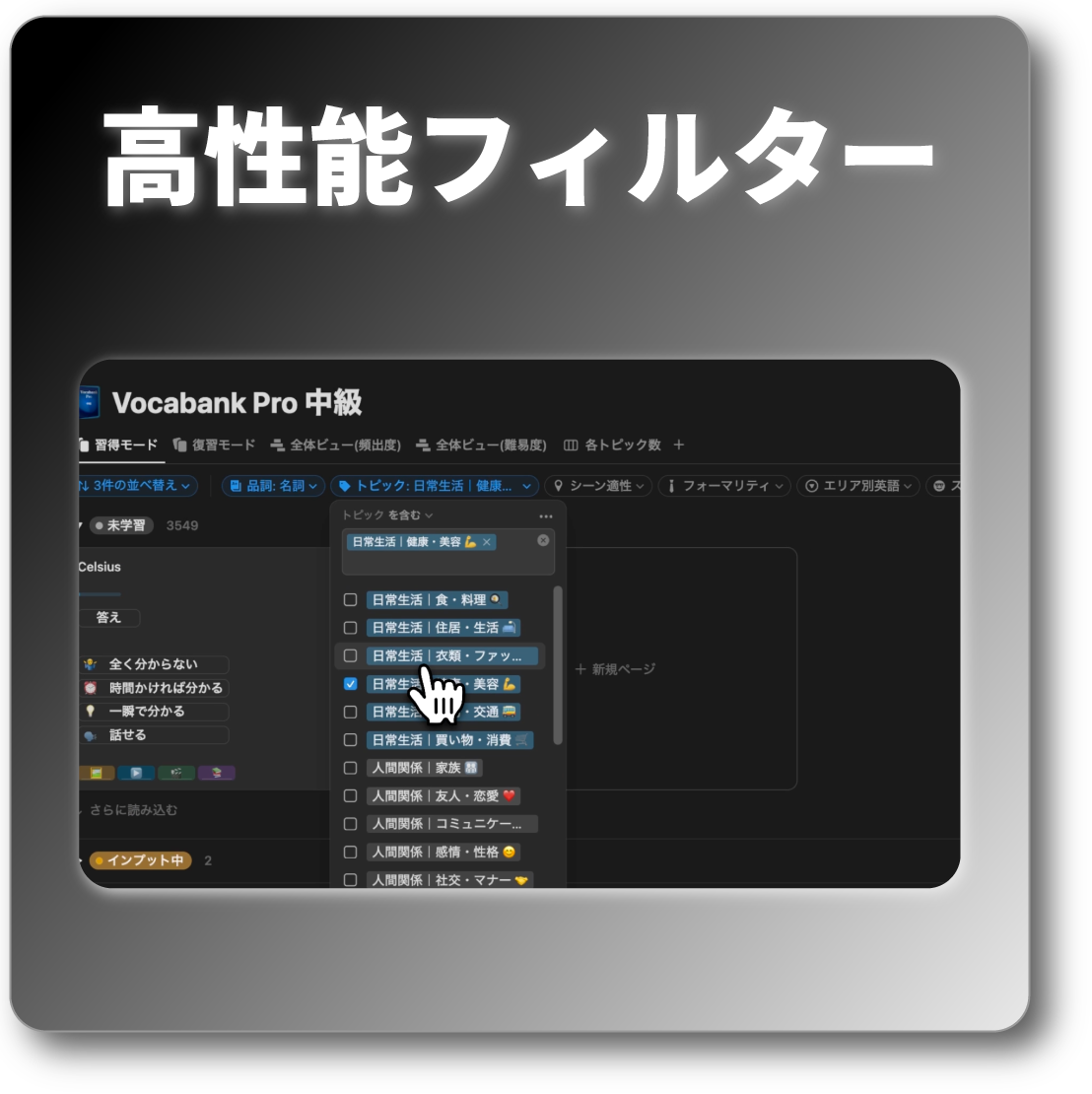 はい、初心者から上級者まで幅広く対応しています。「頻出度」や「難易度」、「トピック」などのタグを使って、自分に合った語彙だけを効率的に学ぶことができます。