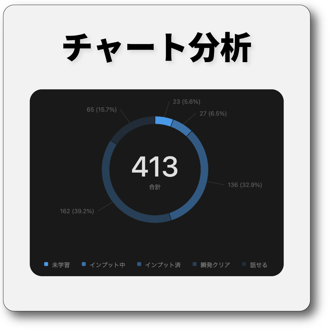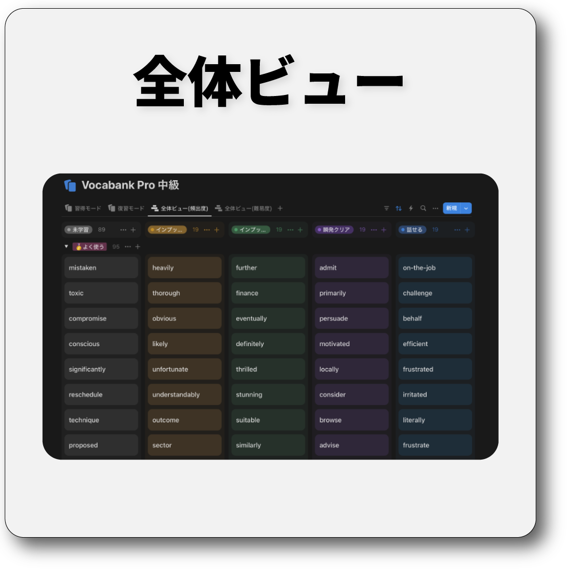 頻出度・習得度・難易度・次回復習日など、Vocabank Pro独自のデータを連動させた高度な数式ロジックにより、単語ごとの重要度を動的にスコア化(0〜100点)しています。詳しくはこちらをご覧ください。