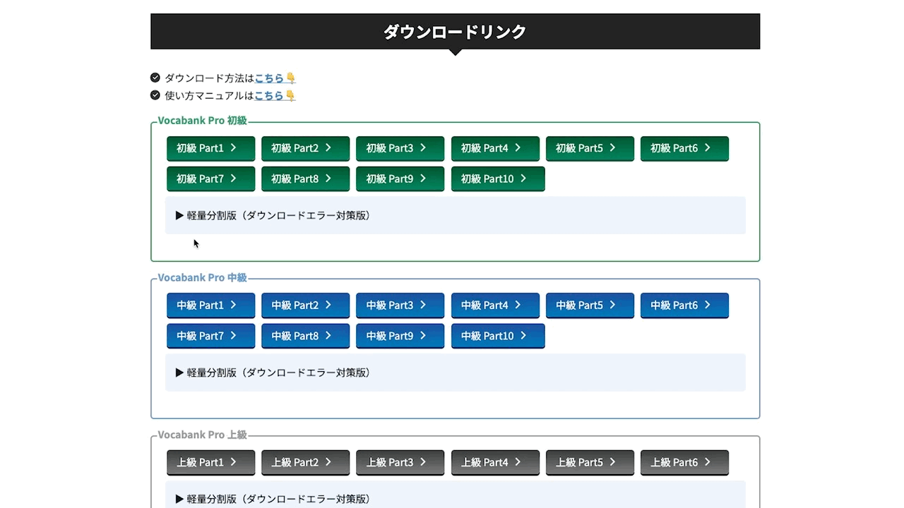 • そのため、上記のNotionの仕様により、Vocabank Pro は『1Part をダウンロードしたら、最低 1 時間空けて次の Part をダウンロード』という手順を推奨しています。